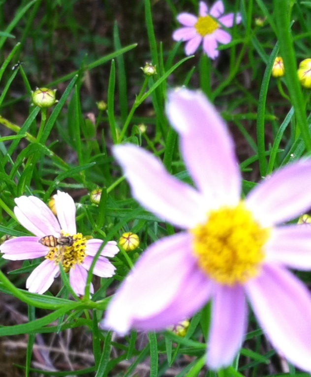 I planted some pink threaded coreopsis, another native perennial, on the west side of my house a couple years ago. It didn’t do very well last year, but this year it has taken off and actually spread, and now it is in full bloom! It was advertised as attractive to butterflies, but so far, all I have seen are numerous sweat bees, barely 3/8 inch long! These are the same bees I wrote about that have been pollinating our beans. In the first picture, I just wanted to show the coreopsis, but the second picture is greatly enlarged to show one of the tiny bees. I actually caught one at rest!