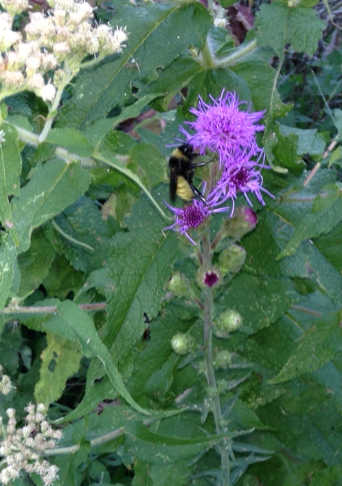 This spring I planted some bare root Northern Blazing Star — Liatris scariosa. It has come up strong and is just now starting to bloom. Last evening I saw that a bumblebee had already found it:
