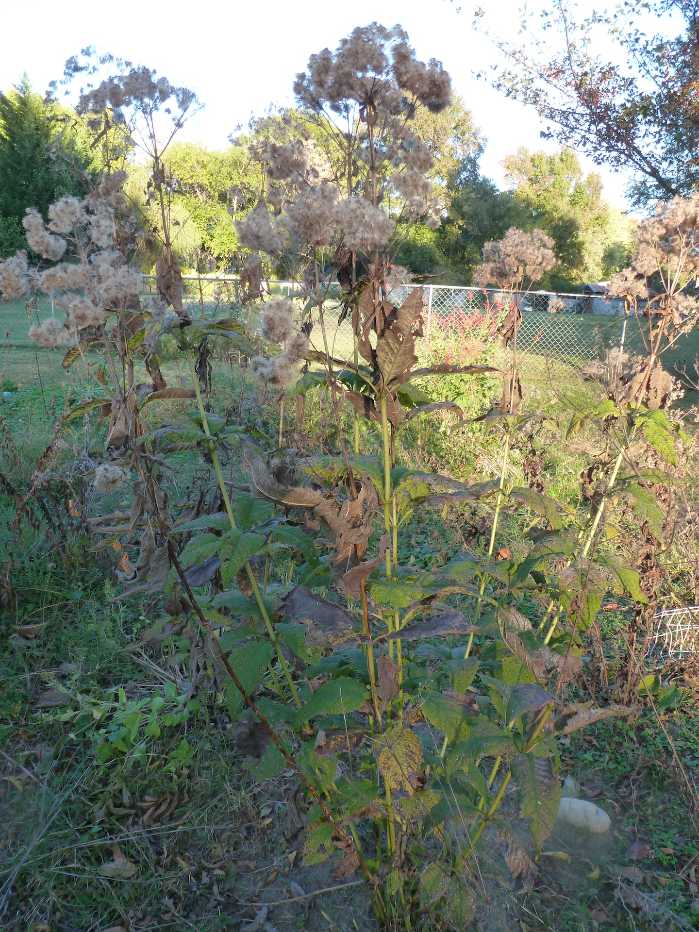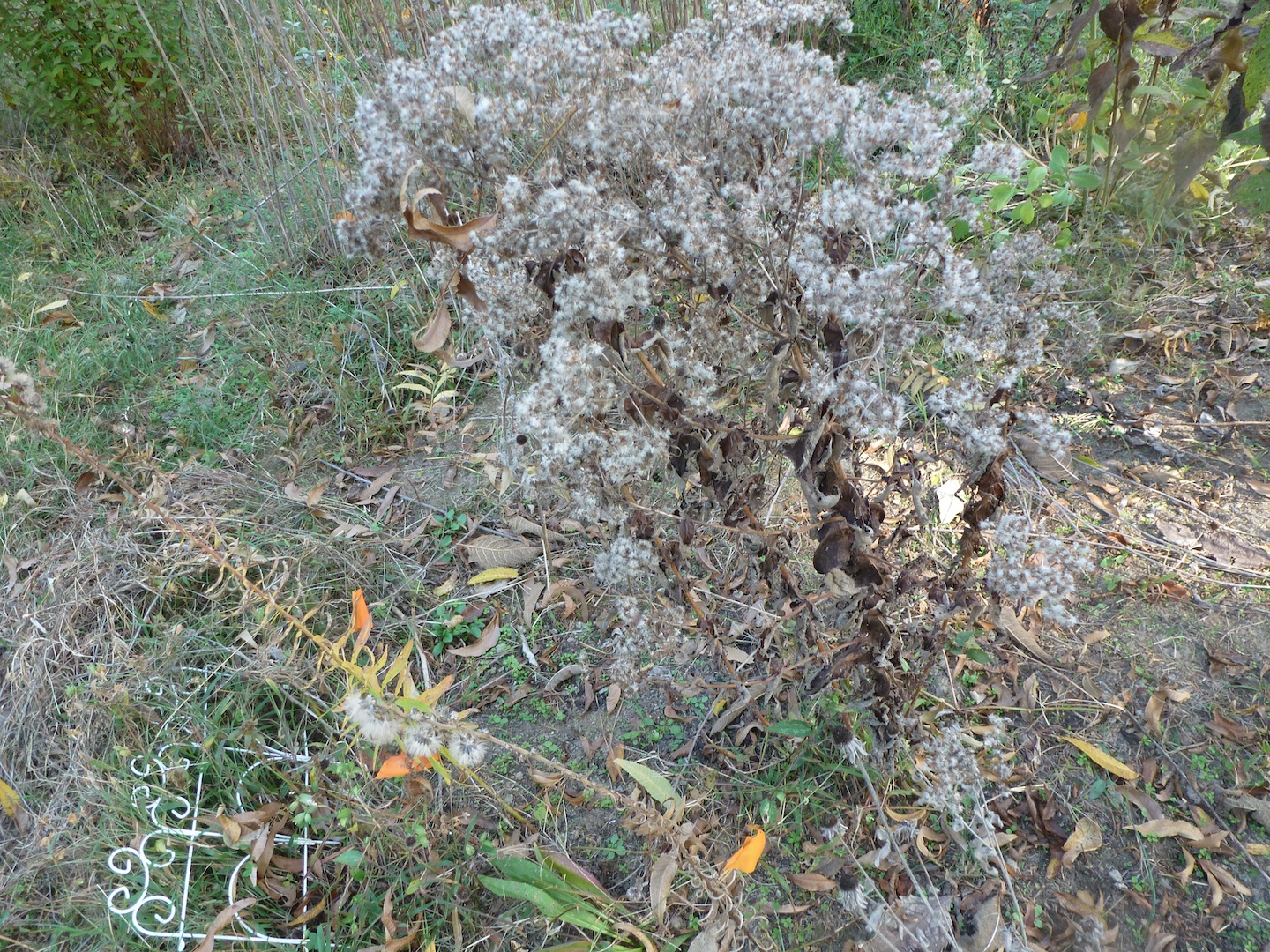 I’m afraid the boneset did not survive the summer’s drought — the plants look too black and just plain dead to me, so I don’t know what will come back next year. It did produce a lot of seed, as in this picture, so maybe it will be able to reseed itself. I’m having to dig up so much wire grass, though — I’m afraid I’m eliminating reseeding.