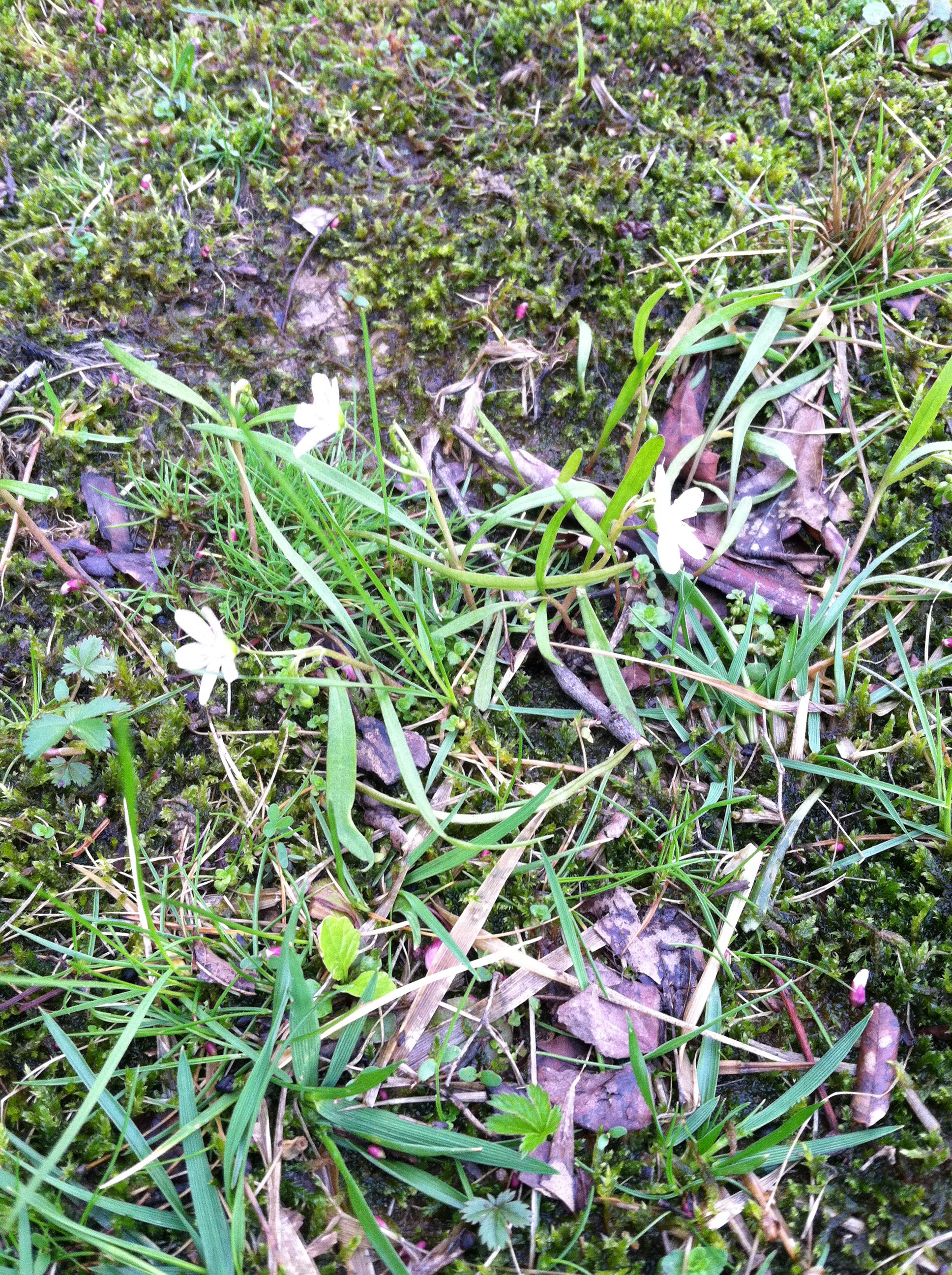 I also happened to be walking along the extremely wet side of my house after torrential rains the night before, and there was a spring beauty blooming in the grass!  I was amazed and delighted, because I had planted a few last spring that a friend had given me, but then took them out because they had Japanese stilt grass mixed in and I definitely didn’t want that.  It never occurred to me that one might have survived sans stilt grass. So here is a picture of my one and only spring beauty: