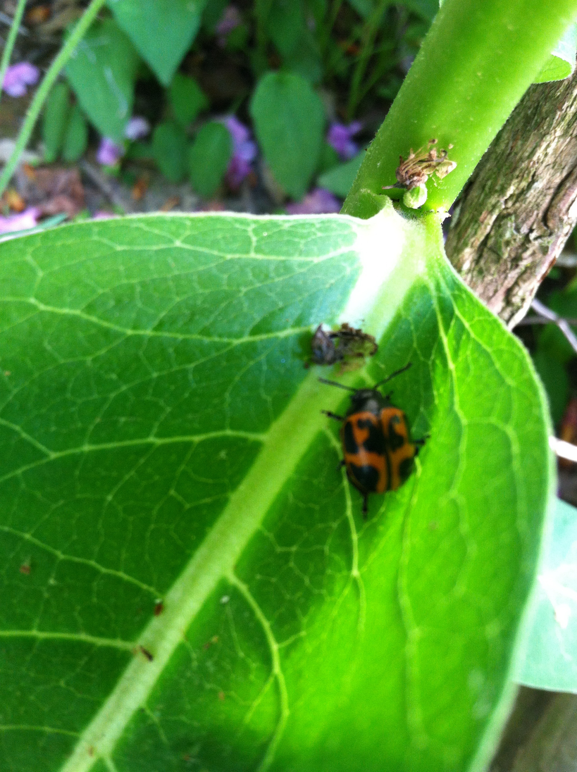 My little common milkweed patch is growing every year, and one of them looks like it is going to bloom.  I think being located on the east side of my house and not getting full sun is why they have never bloomed before.  Monarchs have been sighted here in northern Delaware, and I have noticed milkweed growing all over the place, along roadsides and in fields, which is very encouraging to me.  So now I have started the “milkweed prowl” where I inspect my milkweed every day to see if anything is happening.  Yesterday I found my first milkweed bug of the season!  According to Milkweed, Monarchs, and More: A Field Guide to the Invertebrate Community in the Milkweed Patch, it is actually called a Swamp Milkweed Leaf Beetle (Labidomera clivicollis) and usually prefers swamp milkweed to protect it from its usual predators, but there it was on my common milkweed!  I guess I’d prefer finding monarch eggs, but a milkweed beetle is better than nothing, and at least the milkweed is being used for something by a native insect!