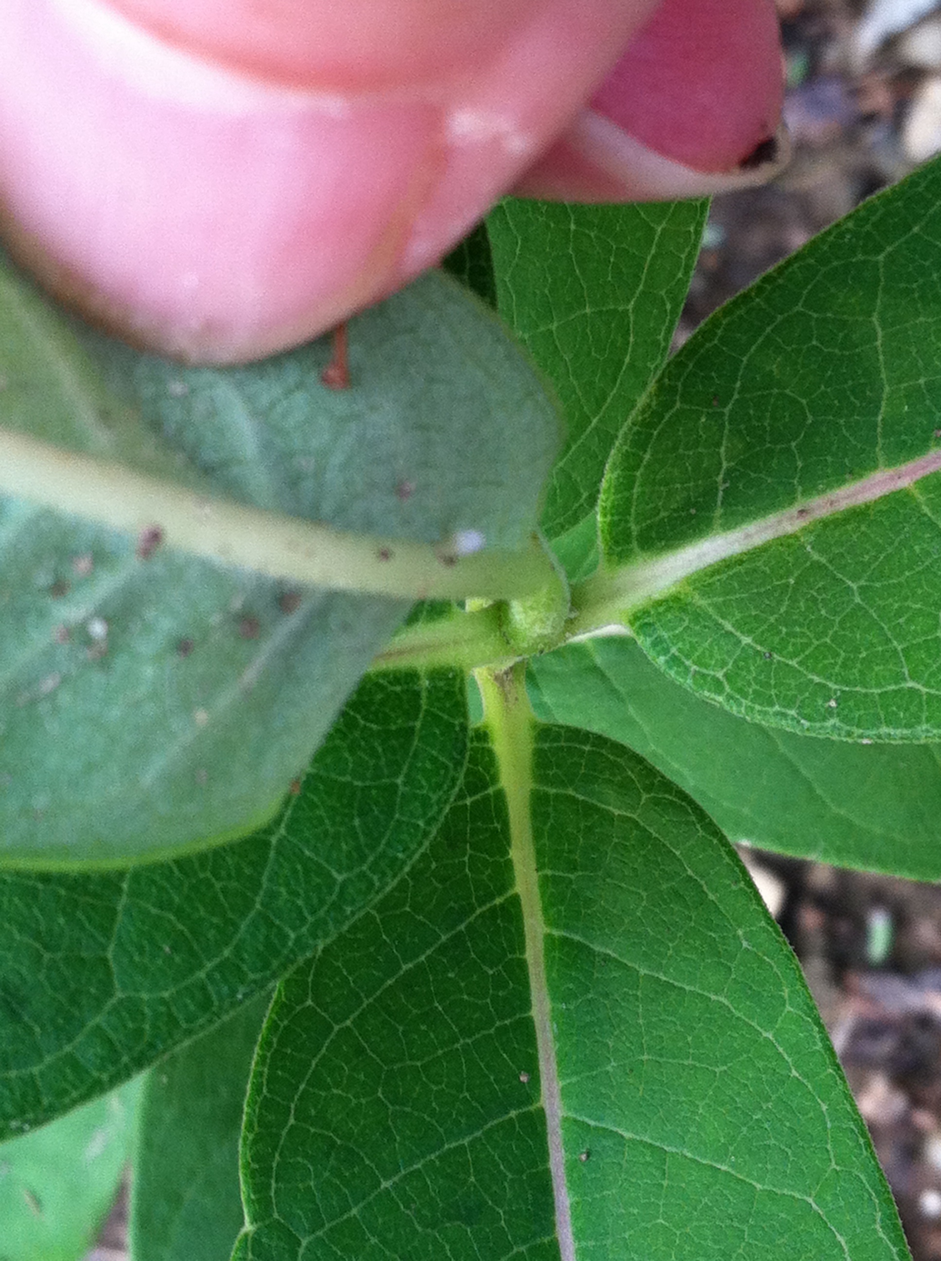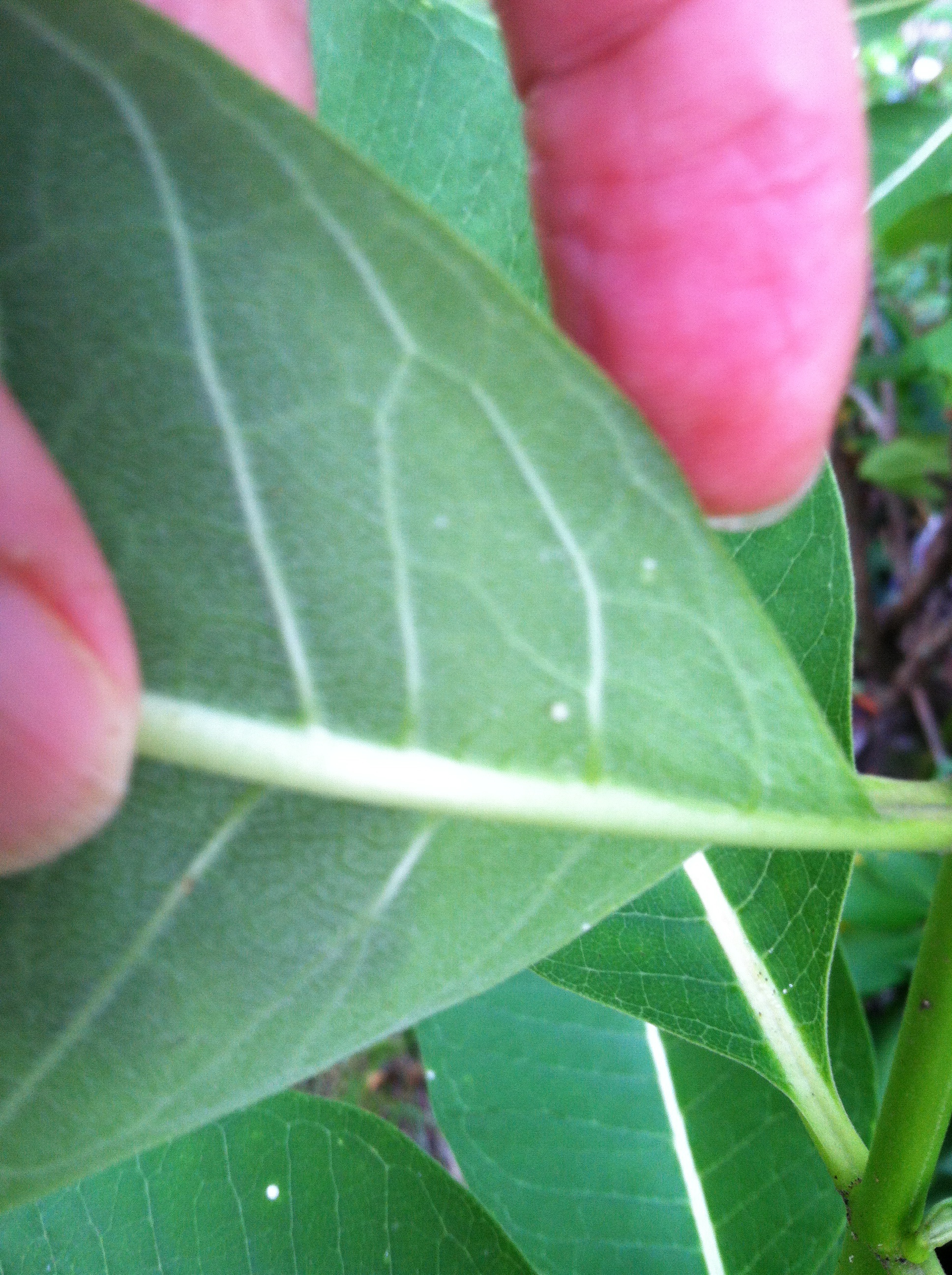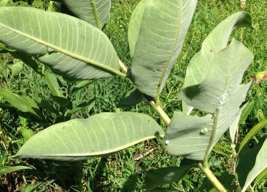 Speaking of common milkweed, does anyone know what this small mass of eggs is? (Lower part of leaf on right)