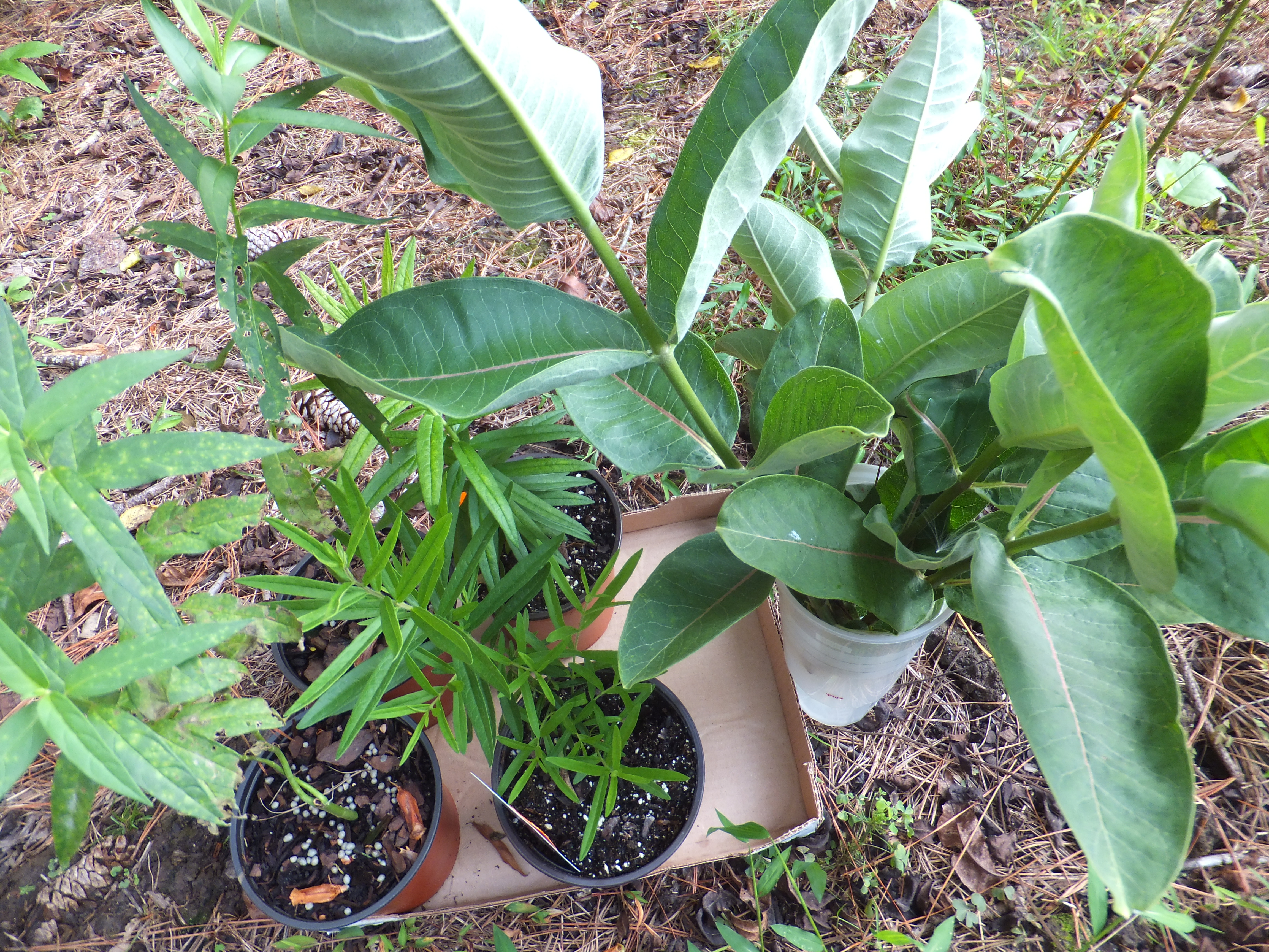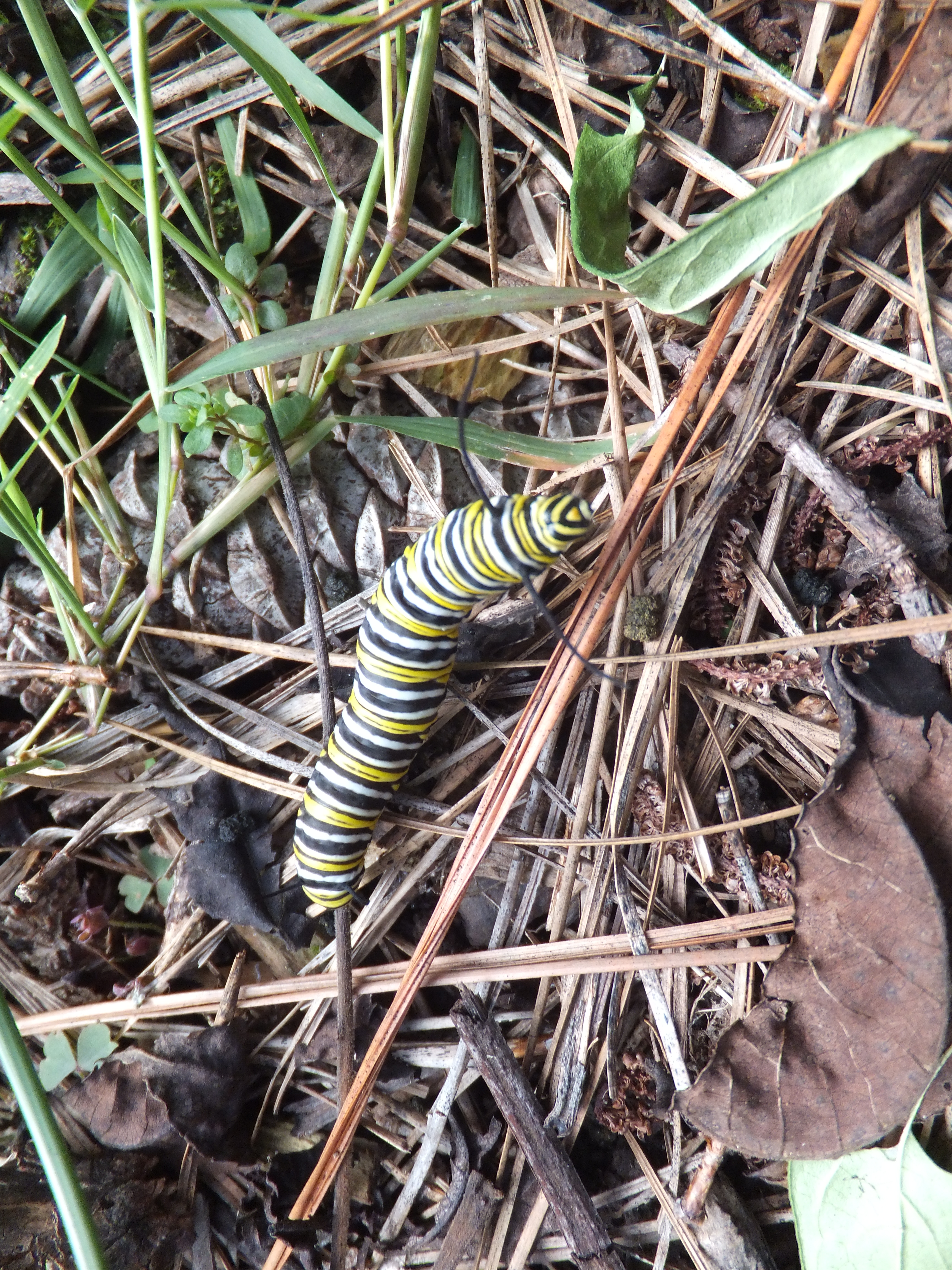 My husband and I were returning from a late afternoon errand, when I looked out the car window and didn’t see the milkweed. I go to investigate and was shocked! Everything, and I mean everything, had been eaten! Only the spindly spines of the plants were left. I go get my camera to take a picture for the blog, fuming to my hubby that the deer ate the MW even though it was deer resistant, that I couldn’t have anything. I take the picture and then think about how we have had afternoon rains everyday this week, and with the wet ground, I should be able to see deer tracks…concrete evidence of the deer. So I look closely at the ground and, lo and behold, see a caterpillar! For a nano-second, I think it might be a Monarch caterpillar, but dismiss it, thinking no way. This is a first year crop of MW, started from seeds. It is, as I had been calling it, my “piddly little crop of MW.” I quickly e-mail the pictures to my sister Robin and then call her, thankfully she was home. She takes one look at the pictures and exclaims that I have a MONARCH CATERPILLAR!!! I say, are you sure??!! She is an expert, I knew she knew a monarch caterpillar when she saw one, I just couldn’t believe it! Then she tells me that, with the extent of the eating, I must have more than one caterpillar. So still on the phone, I go out to look closer and found three more! Then she tells me I HAVE TO GET MORE MW. It is now 5:40, Saturday evening, and again I’m thinking, no way. I then remembered there was suppose to be a native plant nursery not far from me, but I had never been there, didn’t know where it was, and figured they would be closed anyway. But I quickly call them and they were open! In panic mode, I explained what was going on and she said they were closing at 6:00 but would stay open for me until 6:15. Because I didn’t know where I was going, I told my hubby he needed to come with me, this was AN EMERGENCY! He was watching the University of GA football game, and to put it mildly, was not a happy camper. With him cursing me, and by the grace of God, we made it to the nursery!